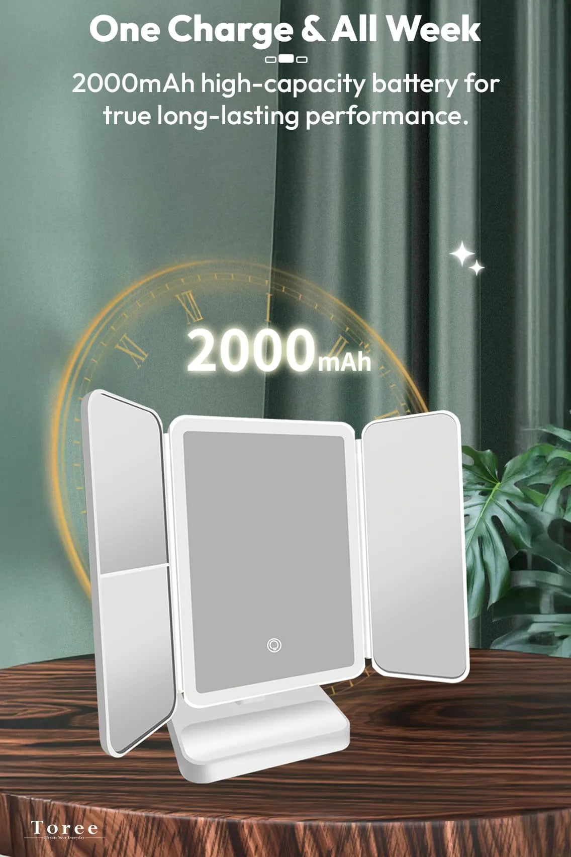 Experience flawless makeup lighting anywhere with the Toree Folding LED Makeup Mirror. Designed with a 3-panel adjustable view, 52 true-color LED beads, and infinitely variable brightness, this mirror delivers perfect lighting for every scenario—day makeup, night skincare, or professional live streaming. With natural, warm, and cold lighting modes and intelligent touch control, your beauty routine becomes effortless. The built-in 2000mAh rechargeable battery provides long-lasting performance with up to a week of use on a single charge.