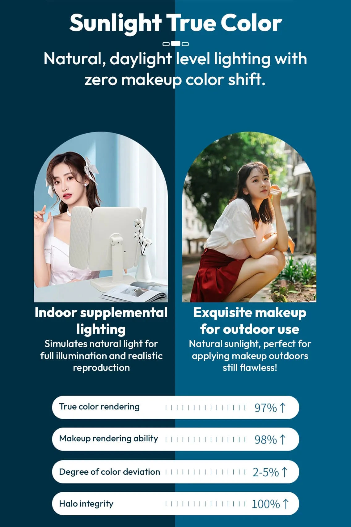 - 3 Light Color Modes — Warm (3200K), Natural Daylight (4800K), and Cool White (7300K) to suit every makeup environment.