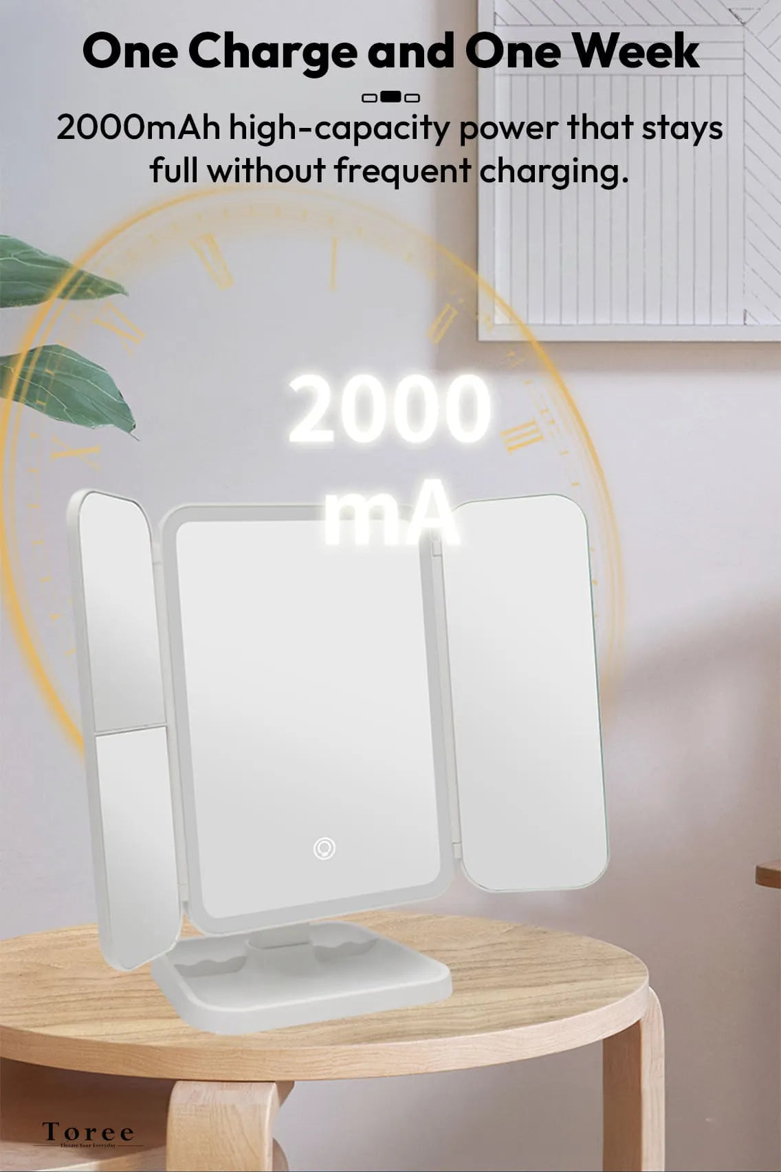 Experience flawless beauty every day with the Toree LED Tri-Fold Makeup Mirror, engineered for crystal-clear silver reflection and professional-grade lighting. Equipped with 52 high-CRI LED lights, stepless dimming, and three color temperature modes, it delivers perfect clarity for makeup, skincare, and grooming. The 2000mAh rechargeable battery provides up to one week of use on a single charge. The foldable tri-panel design ensures wide-angle viewing, while the smart storage base keeps your essentials neatly organized.